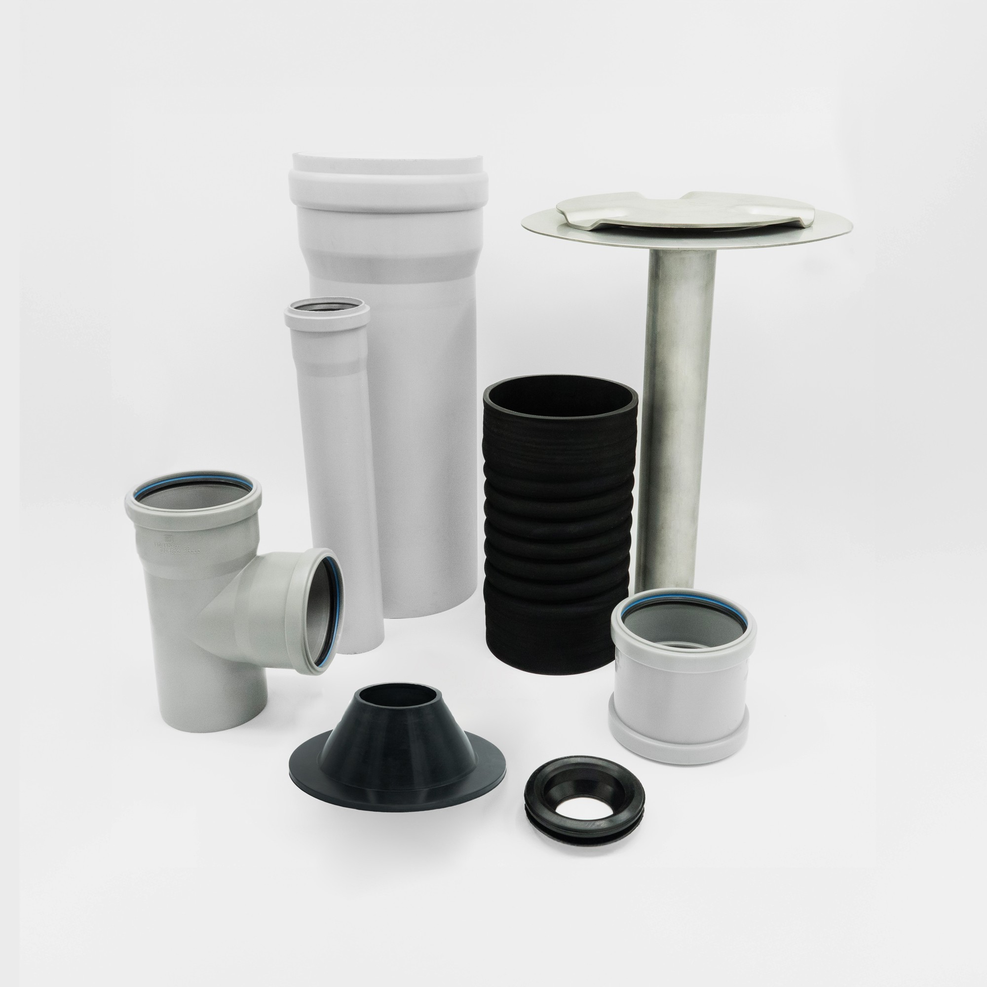 Sistemul de conducte este completat de o gamă largă de fitinguri standard cu un inel de etanșare rezistent la împingere. Sunt disponibile și produse suplimentare pentru suprastructură, cum ar fi scurgeri de ape pluviale, sisteme de etanșare a drenajului, conectori flexibili pentru țevi și etanșări EPDM pentru țevi de admisie. Sunt posibile și soluții personalizate specifice proiectului pentru a îndeplini cerințe specifice.